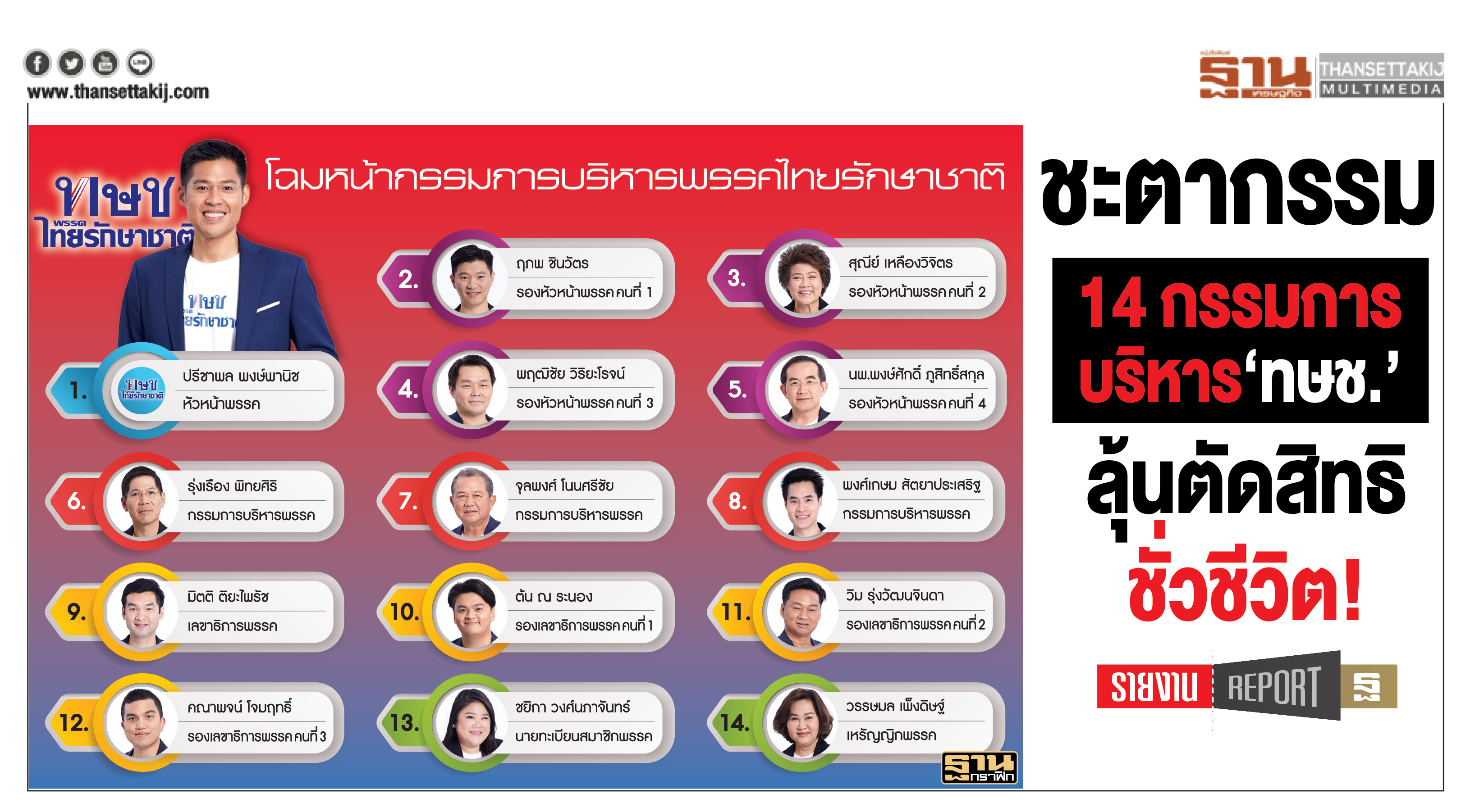 "14 กรรมการบริหารพรรค ทษช." ที่ต้องลุ้นผลของคดีนี้ อันประกอบด้วย 1.ร.ท.ปรีชาพล พงษ์พานิช หัวหน้าพรรค, 2.นายฤภพ ชินวัตร, 3.นางสาวสุณีย์ เหลืองวิจิตร, 4.นายพฤฒิชัย วิริยะโรจน์, 5.นพ.พงษ์ศักดิ์ ภูสิทธิ์สกุล, 6.นายรุ่งเรือง พิทยศิริ (อ้างได้ลาออกแล้ว)
