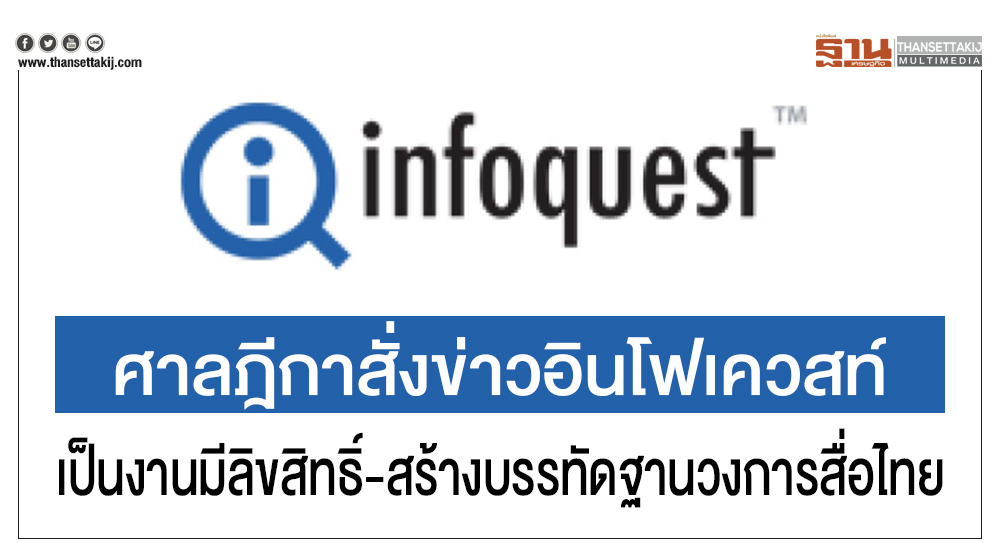 ผู้สื่อข่าวรายงานว่า วันนี้ (2 เม.ย.) ศาลฎีกาแผนกคดีทรัพย์สินทางปัญญาและการค้าระหว่างประเทศได้มีคําพิพากษาเป็นที่สุดแล้ว วินิจฉัยให้งานสร้างสรรค์ประเภทบทความ รายงานพิเศษ และบทสัมภาษณ์ของอินโฟเควสท์ เป็นงานอันมีลิขสิทธิ์ตามพระราชบัญญัตลิขสิทธิ์ พ.ศ. 2537 และตัดสินให้อินโฟเควสท์ไล่รับชดใช้ค่าเสียหายจากการถูกละเมิดโดยการทำและเผยแพร่ต่อโดยไม่ได้รับอนุญาต นับเป็นคดีแรกเกี่ยวกับการละเมิดงานข่าวที่ขึ้นถึงขั้นศาลฎีกา เป็นการยกระดับความสําสัญในเรื่องทรัพย์สินทางปัญญาในวงการสื่อสารมวลชนไทย