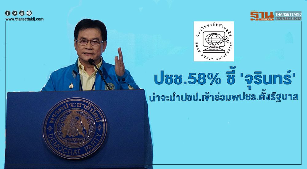 ตามที่พรรคประชาธิปัตย์ได้จัดให้มีการเลือกตั้งหัวหน้าพรรคคนใหม่ในวันที่ 15 พฤษภาคม 2562 ผลการเลือกตั้งปรากฎว่า นายจุรินทร์ ได้รับชัยชนะเป็นหัวหน้าพรรคประชาธิปัตย์คนที่ 8 ทำให้หลายฝ่ายต่างจับตามองโดยเฉพาะกรณีการเข้าร่วมเป็นรัฐบาล ณ ขณะนี้ว่าจะเป็นอย่างไรต่อไป เพื่อสะท้อนความคิดเห็นของประชาชนที่สนใจติดตามข่าวการเมือง “สวนดุสิตโพล” มหาวิทยาลัยสวนดุสิต จึงได้สำรวจความคิดเห็นของประชาชนทั่วประเทศ กรณี หัวหน้าพรรคประชาธิปัตย์คนใหม่ จำนวนทั้งสิ้น 1,017 คน ระหว่างวันที่ 15-17 พฤษภาคม 2562 สรุปผลได้ ดังนี้