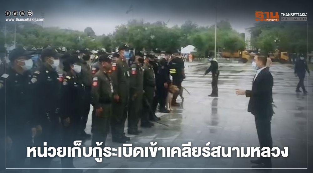โดยเจ้าหน้าที่กลุ่มงานเก็บกู้วัตถุระเบิด บก.สปพ.บช.น. นำเครื่องตรวจเข้าสแกนวัตถุระเบิด สุนัขตำรวจ เข้าเคลียร์พื้นที่ท้องสนามหลวงขณะเดียวกันเจ้าหน้าที่เทศกิจ พนักงานทำความสะอาด ได้ทำความสะอาดรอบพื้นที่การชุมนุม
