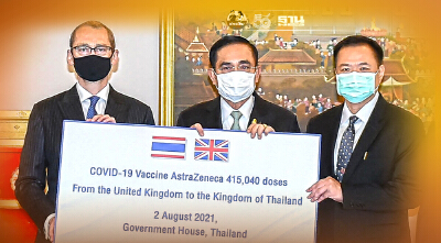 พล.อ.ประยุทธ์" เป็นประธาน รับมอบ "วัคซีนแอสตร้าเซนเนก้า" จากรัฐบาลสหราชอาณาจักร 415,040 โดส พร้อม ถวายพระพร สมเด็จพระราชินีนาถเอลิซาเบธที่ 2 ทรงพระเกษมสำราญ ย้ำ สัมพันธ์แน่นแฟ้น อุปทูตฯ เผย ส่งถึงไทย 3 ส.ค. นี้