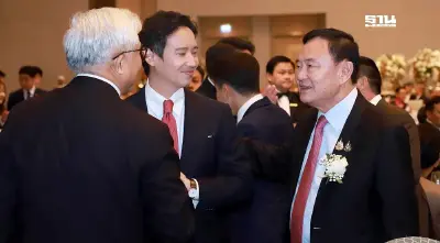 นายทักษิณเดินทางมาถึงงานในเวลา 18.15 น. พร้อมทีมงานสำคัญ เช่น นายภูมิธรรม เวชยชัย และนายชูศักดิ์ ศิรินิล ก่อนร่วมถ่ายภาพกับบ่าวสาวและเขียนคำอวยพรว่า