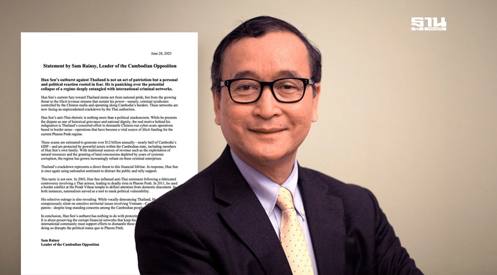 สม รังสี อดีตผู้นำฝ่ายค้านกัมพูชา ออกแถลงการณ์ เมื่อวันที่ 28 มิถุนายน วิจารณ์การแสดงท่าทีต่อต้านไทยของ ฮุน เซน ว่า การระเบิดความโกรธของ ฮุน เซน ต่อไทยไม่ใช่การแสดงออกถึงความรักชาติ แต่เป็นปฏิกิริยาส่วนตัวและทางการเมืองที่เกิดจากความหวาดกลัว เขากำลังตื่นตระหนกต่อการล่มสลายที่อาจเกิดขึ้นของระบอบการปกครองที่เกี่ยวพันอย่างลึกซึ้งกับเครือข่ายอาชญากรรมระหว่างประเทศ