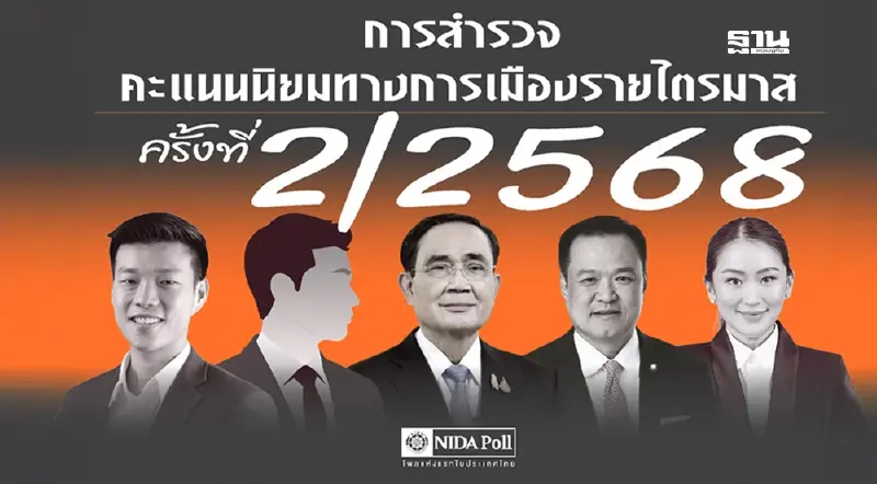 ศูนย์สำรวจความคิดเห็น สถาบันบัณฑิตพัฒนบริหารศาสตร์ (นิด้าโพล) เปิดเผยผลการสำรวจ เรื่อง “คะแนนนิยมทางการเมืองรายไตรมาส ครั้งที่ 2-2568” สำรวจระหว่างวันที่ 19-25 มิ.ย. 2568 จากประชาชนที่มีอายุ 18 ปีขึ้นไป กระจายทุกภูมิภาค ระดับการศึกษา อาชีพ และรายได้ ทั่วประเทศ รวมจำนวนทั้งสิ้น 2,500 หน่วยตัวอย่าง เกี่ยวกับคะแนนนิยมทางการเมือง จากการสำรวจ
