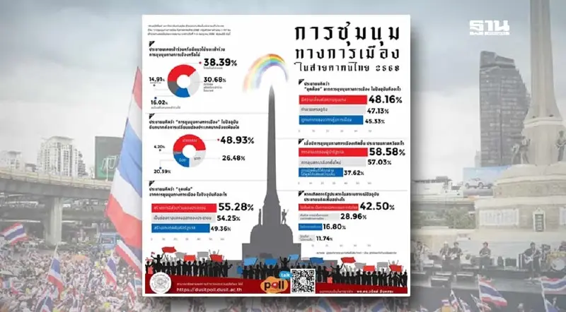 “สวนดุสิตโพล” มหาวิทยาลัยสวนดุสิต สำรวจความคิดเห็นประชาชนทั่วประเทศ เรื่องการชุมนุมทางการเมืองในสายตาคนไทย 2568 กลุ่มตัวอย่าง จำนวน 1,167 คน จากการสำรวจทางออนไลน์และภาคสนาม ระหว่างวันที่ 1-4 กรกฎาคม 2568 พบว่า
