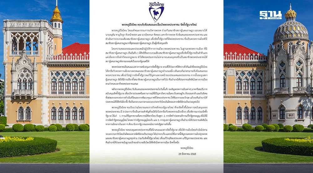พรรคภูมิใจไทย ได้ออกแถลงการณ์ วันที่ 29 สิงหาคม 2568 ว่า พรรคภูมิใจไทย โดยมติคณะกรรมการบริหารพรรค ร่วมกับสมาชิกสภาผู้แทนราษฎร มอบหมายให้นายอนุทิน ชาญวีรกูล หัวหน้าพรรค และ นายไชยชนก ชิดชอบ เลขาธิการพรรค รับข้อเสนอของพรรคประชาชน และดำเนินการรวบรวมเสียงสมาชิกสภาผู้แทนราษฎร เพื่อจัดตั้งรัฐบาลที่มีพรรคประชาชน ซึ่งเป็นพรรคการเมืองที่มีสมาชิกสภาผู้แทนราษฎรมากที่สุดของสภาผู้แทนราษฎร เป็นผู้สนับสนุนหลัก