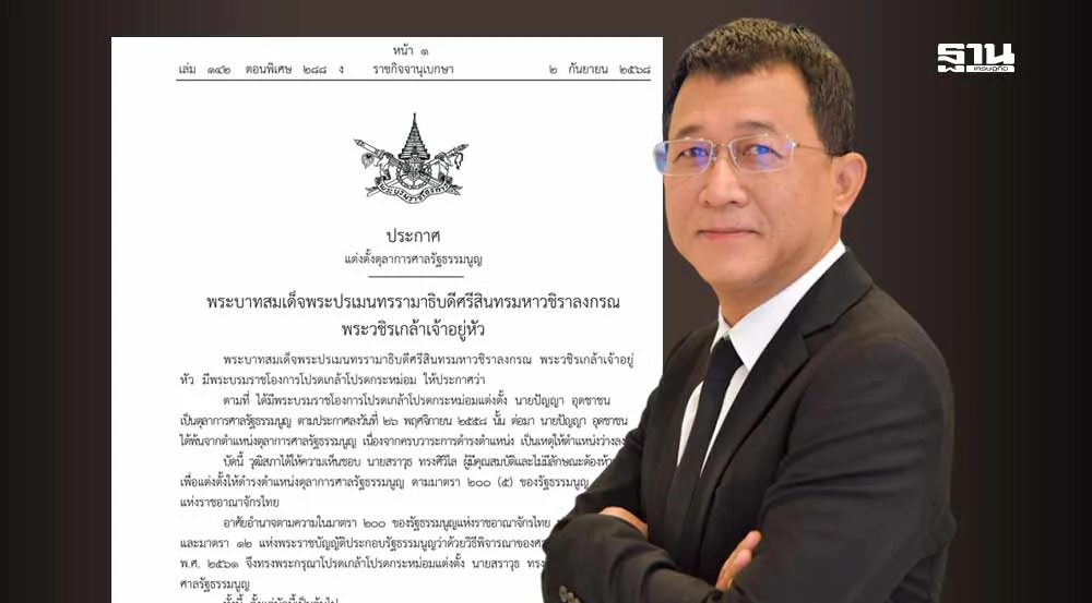 ราชกิจจานุเบกษา เล่ม 142 ตอนพิเศษ 284 ง วันที่ 2 กันยายน 2568 เผยแพร่ประกาศพระบรมราชโองการโปรดเกล้าโปรดกระหม่อม แต่งตั้ง นายสราวุธ ทรงศิวิไล ดำรงตำแหน่งตุลาการศาลรัฐธรรมนูญ