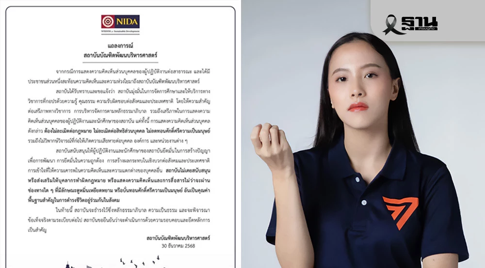 นิด้าออกแถลงการณ์ยืนยันไม่สนับสนุนการดูหมิ่นใคร หลังไอซ์ รักชนก ศรีนอก พรรคประชาชนตั้งคำถามถูกอาจารย์โพสต์โจมตี