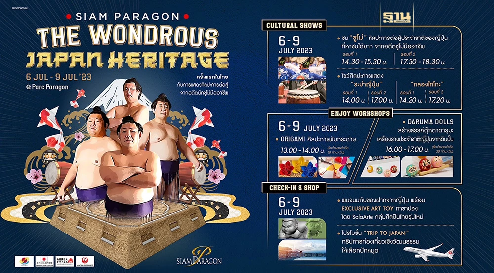 สยามพารากอน ตอกย้ำความเป็นโกลบอลเดสติเนชั่น จุดหมายปลายทางที่ทั้งคนไทยและนักท่องเที่ยวจากทั่วโลกยกให้เป็นหมุดหมายอันดับหนึ่งในใจที่ต้องมาเยือน และยังเป็นเวทีระดับโลกที่นำเสนอสุดยอดประสบการณ์เหนือความคาดหมาย ร่วมกับ สถานเอกอัครราชทูตญี่ปุ่นประจำประเทศไทย, Sumo Experience (ซูโม่ เอ็กซ์พีเรียนซ์) สำนักสืบทอดและเผยแพร่วัฒนธรรมซูโม่จากญี่ปุ่น และ Japan Airlines (เจแปน แอร์ไลน์) สายการบินแห่งชาติญี่ปุ่น ร่วมฉลองครบรอบ 136 ปี ความสัมพันธ์ทางการทูต อันแน่นแฟ้นระหว่างไทยและญี่ปุ่น ชวนสัมผัสจิตวิญญาณอันทรงพลังของซูโม่ กีฬาประจำชาติญี่ปุ่นที่สืบทอดมายาวนานกว่า 2,000 ปี กับการแสดงแข่งขันซูโม่ส่งตรงจากแดนอาทิตย์อุทัย ครั้งแรกในประเทศไทย นับเป็นโอกาสพิเศษที่หาชมได้ยาก ในงาน “Siam Paragon The Wondrous Japan Heritage” โดยเปิดให้ ชมฟรี ระหว่างวันที่ 6-9 กรกฎาคม 2566 ณ พาร์ค พารากอน สยามพารากอน
