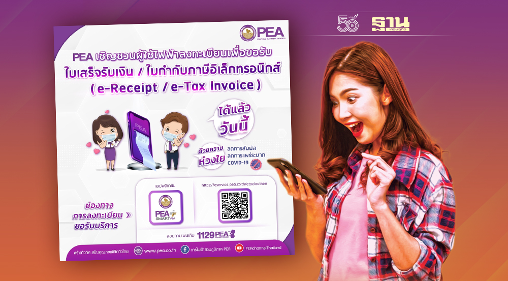 การไฟฟ้าส่วนภูมิภาค (PEA) เปิดให้ผู้ใช้ไฟฟ้าลงทะเบียนเพื่อขอรับใบเสร็จรับเงิน ใบกำกับภาษีอิเล็กทรอนิกส์ได้แล้ววันนี้ ผ่าน e-Service ช่องทางการลงทะเบียนขอรับบริการใบเสร็จรับเงิน/ใบกำกับภาษีอิเล็กทรอนิกส์ ดังนี้
