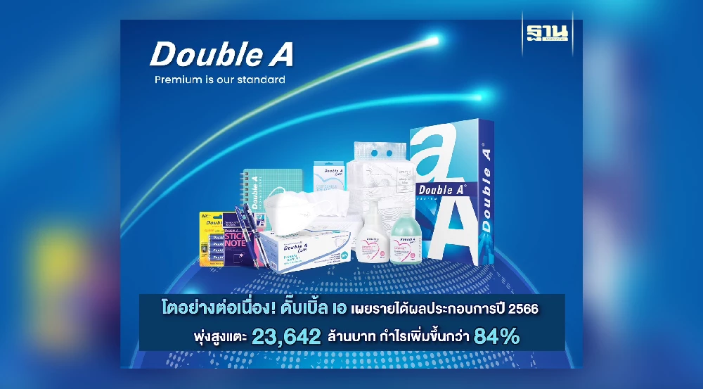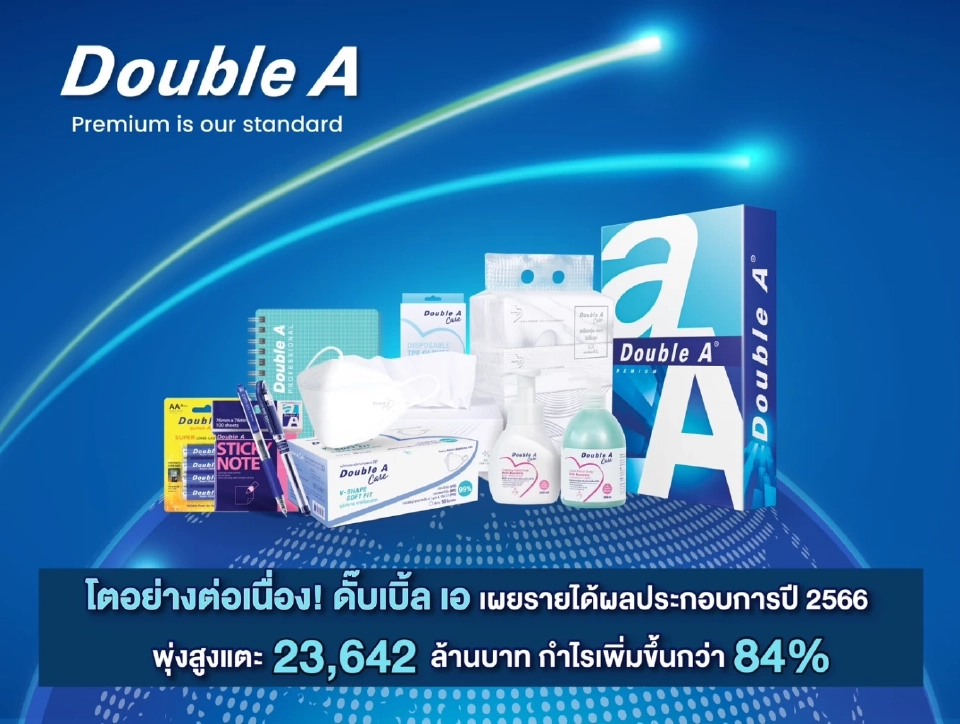 บริษัท ดั๊บเบิ้ล เอ (1991) จำกัด (มหาชน) เผยผลประกอบการปี 2566 มีรายได้รวม 23,642 ล้านบาท กำไรสุทธิ 1,722 ล้านบาท เพิ่มขึ้น 786 ล้านบาท หรือคิดเป็น 84% เมื่อเทียบกับปีก่อน