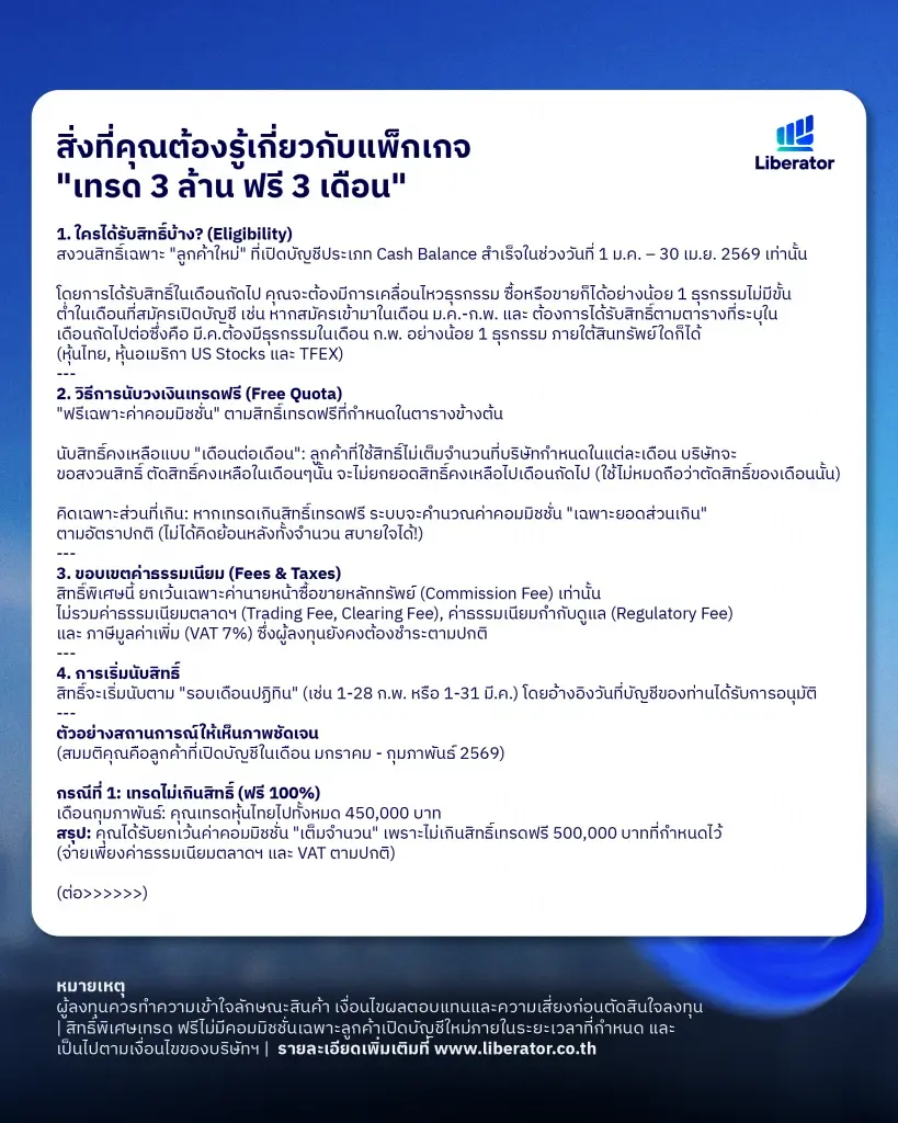 หมายเหตุ สิทธิพิเศษนี้เฉพาะลูกค้าใหม่ที่เปิดบัญชี Cash Balance และได้รับอนุมัติภายในระยะเวลาแคมเปญ ฟรีเฉพาะค่าคอมมิชชั่นตามโควตาที่กำหนด ไม่รวมค่าธรรมเนียมอื่นและภาษีมูลค่าเพิ่ม 7% สิทธิ์ไม่สามารถทบยอดได้ และการซื้อขายเกินโควตาจะคิดค่าคอมมิชชั่นเฉพาะส่วนที่เกิน หุ้นสหรัฐฯ ฟรีค่าคอมมิชชั่นเฉพาะหุ้นที่มีราคามากกว่า 6.67 ดอลลาร์สหรัฐต่อหุ้น บริษัทขอสงวนสิทธิ์ในการเปลี่ยนแปลงเงื่อนไขตามประกาศ ผู้ลงทุนควรทำความเข้าใจลักษณะสินค้า เงื่อนไขผลตอบแทน และความเสี่ยงก่อนตัดสินใจลงทุน รายละเอียดเพิ่มเติมดูได้ที่ www.liberator.co.th