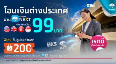 ธนาคารกรุงไทย ชูแคมเปญสุดคุ้ม เอาใจลูกค้าโอนเงินต่างประเทศ เมื่อโอนผ่าน Krungthai NEXT ใน 4 สกุลเงิน คือ ดอลลาร์สหรัฐ(USD), ปอนด์อังกฤษ (GBP), ดอลลาร์สิงคโปร์(SGD), และดอลลาร์ฮ่องกง (HKD) ค่าธรรมเนียมเพียง 99 บาท ต่อรายการ พร้อมรับอัตราแลกเปลี่ยนพิเศษ เมื่อเลือกโอนออกจาก Krungthai Travel Card บนแอปฯ Krungthai NEXT และลงทะเบียนรับคูปองส่วนลด Shopee 200 บาท