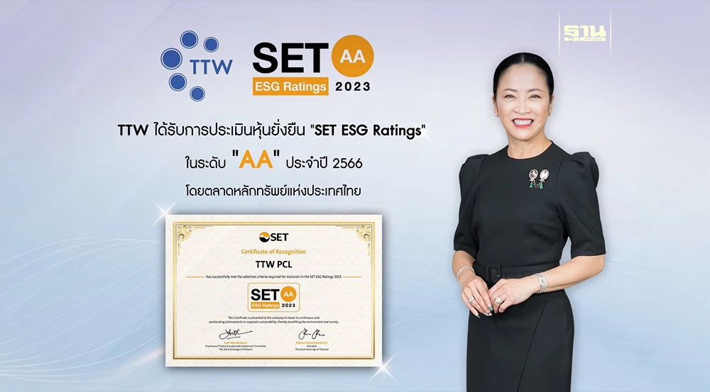 บริษัท ทีทีดับบลิว จำกัด (มหาชน) หรือ TTW ได้รับการประเมินหุ้นยั่งยืน “SET ESG Rating” ในระดับ AA ประจำปี 2566 จากตลาดหลักทรัพย์แห่งประเทศไทย โดยเป็น 1 ใน 193 บริษัทจดทะเบียนที่ได้รับการประกาศผลประเมินหุ้นยั่งยืน SET ESG Ratings สะท้อนให้เห็นว่า TTW ให้ความสำคัญต่อการพัฒนาธุรกิจอย่างยั่งยืน โดยยกระดับการดำเนินงานและการจัดทำรายงานภายใต้กรอบ ESG (Environmental, Social and Governance) ในทุกมิติ เป็นบริษัทที่มีการนำแนวคิดด้านความยั่งยืนเข้าเป็นส่วนหนึ่งในกระบวนการดำเนินธุรกิจ โดยคำนึงถึงการบริหารความเสี่ยงและเตรียมพร้อมรับความเสี่ยงที่เกิดขึ้นใหม่ (Emerging Risks) อีกทั้งพร้อมรับมือกับปัจจัยการเปลี่ยนแปลงด้านสังคมและสิ่งแวดล้อมและให้ความสำคัญกับผู้มีส่วนได้เสียทุกภาคส่วนได้อย่างสมดุล