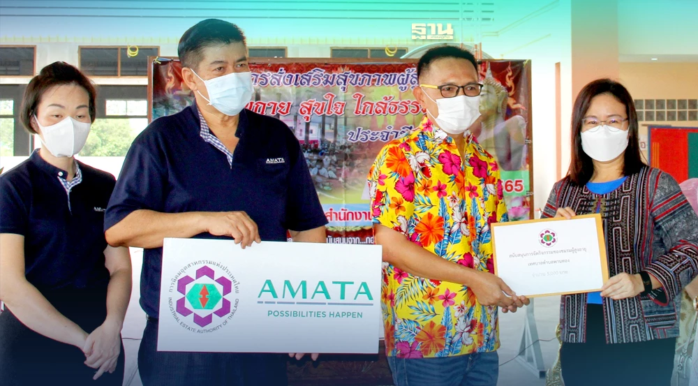 นายสานิด แขกสะอาด ผู้จัดการฝ่ายชุมชนสัมพันธ์ บริษัท อมตะ คอร์ปอเรชัน จำกัด(มหาชน) พร้อมด้วยทีมซีเอสอาร์ อมตะ และสนง.นิคมอุตสาหกรรมอมตะซิตี้ ชลบุรี ร่วมโครงการส่งเสริมสุขภาพผู้สูงอายุ "สุขกาย สุขใจ ใกล้ธรรม" ประจำปี 2565