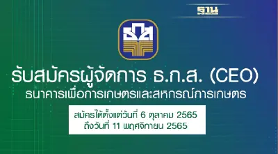 ธนาคารเพื่อการเกษตรและสหกรณ์การเกษตร (ธ.ก.ส.) ประกาศรับสมัครบุคคลเพื่อคัดเลือกเข้าดำรงตำแหน่งผู้จัดการ ธ.ก.ส. โดยคุณสมบัติทั่วไปของผู้สมัคร ต้องมีสัญชาติไทย อายุไม่เกิน 58 ปีบริบูรณ์ ในวันยื่นใบสมัคร มีสุขภาพสมบูรณ์แข็งแรง ไม่เป็นโรคติดต่อร้ายแรง คุณวุฒิการศึกษา ไม่ต่ำกว่าระดับปริญญาตรีและไม่มีลักษณะต้องห้ามตามประกาศคณะกรรมการสรรหาผู้จัดการ ธ.ก.ส. ในส่วนของคุณสมบัติเฉพาะตำแหน่งต้องมีความรอบรู้และประสบการณ์ในการบริหารจัดการขององค์กรขนาดใหญ่ เป็นหรือเคยเป็นผู้บริหารจากส่วนราชการ รัฐวิสาหกิจ หรือหน่วยงานอื่นใดของรัฐ ต้องดำรงตำแหน่งไม่ต่ำกว่ารองผู้บริหารสูงสุดขององค์กร หรือเป็นหรือเคยเป็นผู้บริหารจากหน่วยงานภาคเอกชน ต้องดำรงตำแหน่งไม่ต่ำกว่ารองผู้บริหารสูงสุดขององค์กรที่มีรายได้ไม่น้อยกว่า 15,000 ล้านบาทต่อปี หรือเคยบริหารกิจการที่มีสินทรัพย์ไม่น้อยกว่า 200,000 ล้านบาท