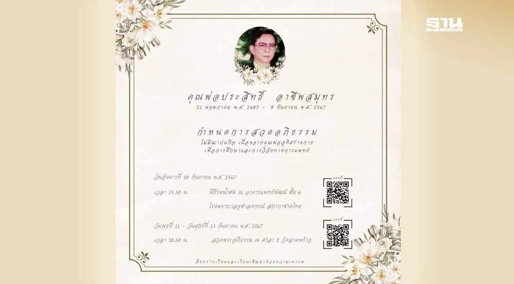 กำหนดการสวดอภิธรรม ไม่มีฌาปนกิจ เนื่องจากคุณพ่ออุทิศร่างกาย เพื่อการศึกษาและการวิจัยทางการแพทย์