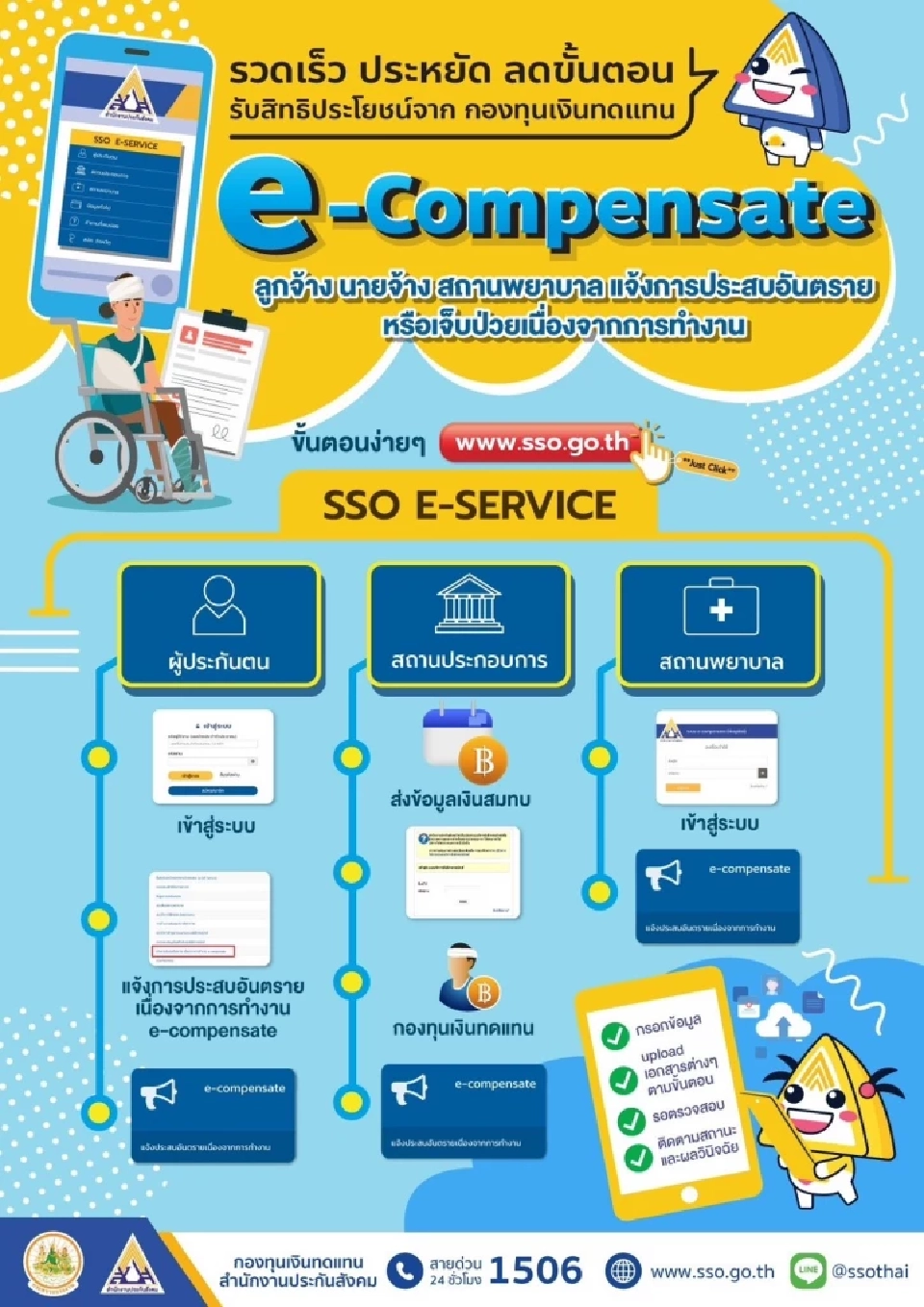 ระบบ "e-Compensate" จากกองทุนเงินทดแทน สำนักงานประกันสังคม จะเป็นตัวช่วยให้นายจ้าง ลูกจ้างและสถานพยาบาล ได้แจ้งการประสบอันตรายหรือเจ็บป่วยเนื่องจากการทำงานของลูกจ้างได้อย่างสะดวกรวดเร็ว ขั้นตอน ง่าย ๆ เพียงคลิกเข้าไปที่เว็บไซต์สำนักงานประกันสังคม www.sso.go.th เลือกหัวข้อ SSO e-Service จากนั้นก็เข้าสู่ระบบ