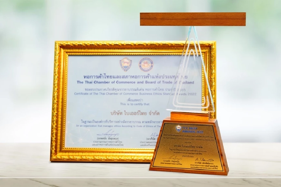 นางสาวจินอา ลี กรรมการผู้จัดการ บริษัท ไบเออร์ไทย จำกัด รับมอบ “รางวัลจรรยาบรรณดีเด่น” หอการค้าไทย ประจำปี 2565 โดยมี นายสนั่น อังอุบลกุล ประธานกรรมการ หอการค้าไทยและสภาหอการค้าแห่งประเทศไทย เป็นผู้มอบรางวัล ภายในงาน “TCC Best Awards 2022: “วิกฤตซ้อนวิกฤต พิชิตด้วยจรรยาบรรณ” ปีที่ 20 จัดโดยหอการค้าไทย เมื่อวันที่ 7 ธันวาคม 2565 ณ มหาวิทยาลัยหอการค้าไทย