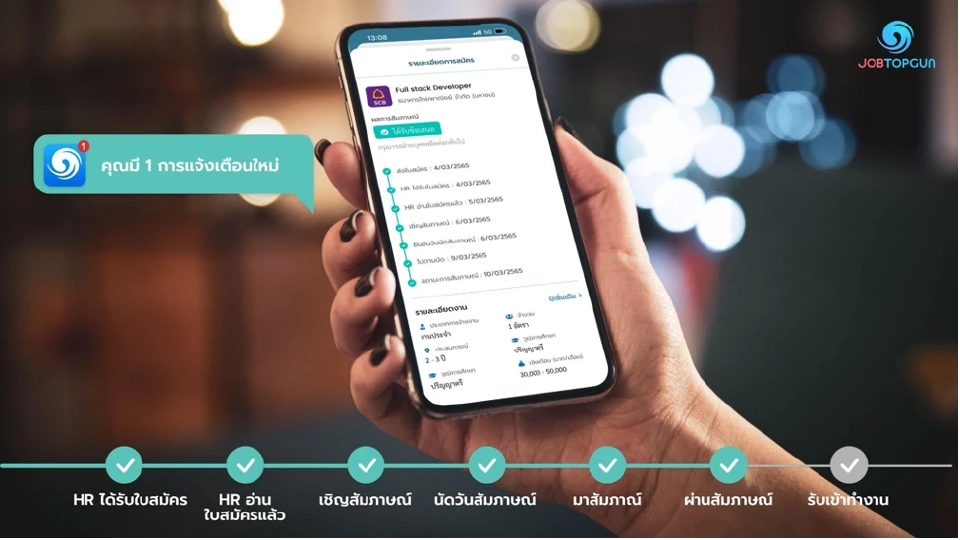JOBTOPGUN มีการอัพเดตสถานะการสมัครงาน ด้วยระบบ Application Tracking ที่แจ้งเตือนทุกขั้นตอนสถานะการสมัครงาน ตั้งแต่เริ่มต้นหลังจากยื่นใบสมัคร การเปิดอ่านใบสมัครงาน วันนัดสัมภาษณ์ ตลอดจนสถานะว่าผ่านสัมภาษณ์หรือไม่ และเริ่มรับเข้าทำงานหรือยัง ไม่ปล่อยให้ผู้สมัครงานรู้สึกเคว้ง สามารถจัดการวางแผนการหางานง่าย ๆ ขึ้น