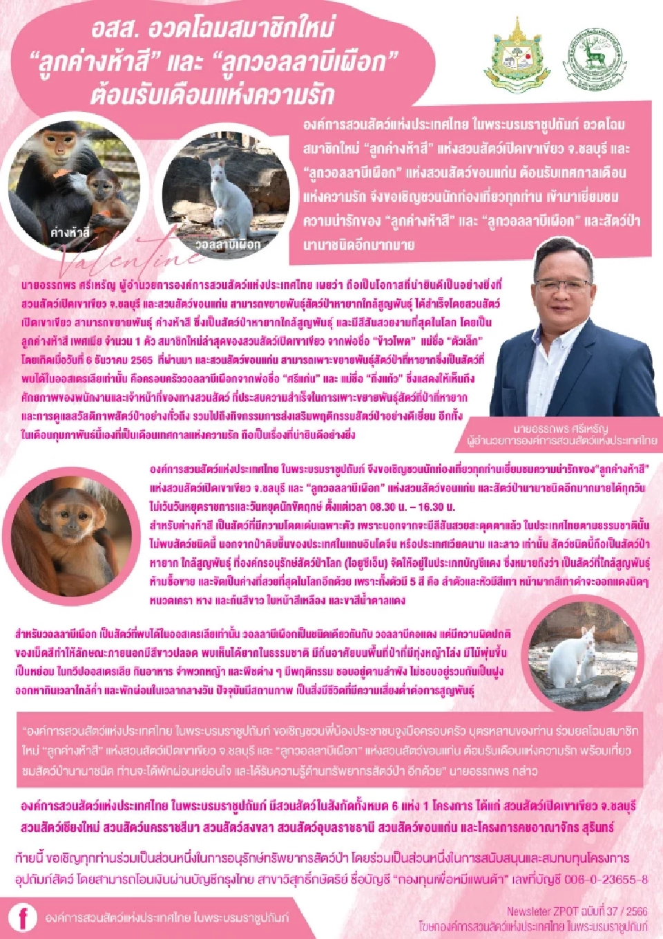 “องค์การสวนสัตว์แห่งประเทศไทย ในพระบรมราชูปถัมภ์ ขอเชิญชวนพี่น้องประชาชนจูงมือครอบครัว บุตรหลานของท่าน ร่วมยลโฉมสมาชิกใหม่ “ลูกค่างห้าสี” แห่งสวนสัตว์เปิดเขาเขียว จ.ชลบุรี และ “ลูกวอลลาบีเผือก” แห่งสวนสัตว์ขอนแก่น ต้อนรับเดือนแห่งความรัก พร้อมเที่ยวชมสัตว์ป่านานาชนิด ท่านจะได้พักผ่อนหย่อนใจ และได้รับความรู้ด้านทรัพยากรสัตว์ป่า อีกด้วย” นายอรรถพร กล่าว