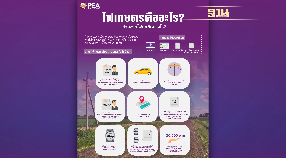 ประชาชนส่วนใหญ่ของประเทศไทย ประกอบอาชีพเกษตรกรรม ดังนั้น การที่จะพัฒนาเศรษฐกิจและสังคมของประเทศจำเป็นต้องยกระดับมาตรฐานความเป็นอยู่ของประชาชนในพื้นที่เกษตรกรรม การไฟฟ้าส่วนภูมิภาค (PEA) ดำเนินโครงการขยายเขตไฟฟ้าให้พื้นที่ทำกินทางการเกษตร เพื่อรองรับความต้องการการใช้ไฟฟ้าในพื้นที่ทำกินทางการเกษตรของเกษตรกร ในการสูบน้ำเข้าพื้นที่ทางการเกษตรเพื่อเป็นการเพิ่มผลผลิตทางด้านเกษตรกรรม ดังนั้น ผู้ที่จะขอไฟเพื่อการเกษตรต้องผ่านเกณฑ์ ดังนี้