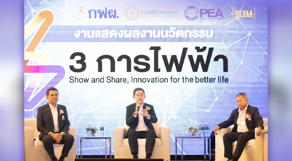 วานนี้ (12 มิถุนายน 2566) 3 การไฟฟ้าจัดงานแสดงผลงานนวัตกรรม (Show and Share, Innovation for the better life) เป็นครั้งแรก เพื่อแลกเปลี่ยนองค์ความรู้ด้านการวิจัยพัฒนา สิ่งประดิษฐ์ และนวัตกรรม รวมทั้งส่งเสริมให้เกิดการพัฒนาต่อยอด ตอบโจทย์การเปลี่ยนแปลงของพฤติกรรมการใช้ไฟฟ้าของผู้บริโภค โดยมีนายบุญญนิตย์ วงศ์รักมิตร ผู้ว่าการการไฟฟ้าฝ่ายผลิตแห่งประเทศไทย (กฟผ.) นายศุภชัย เอกอุ่น ผู้ว่าการการไฟฟ้าส่วนภูมิภาค (กฟภ.) และ นายวิลาศ เฉลยสัตย์ ผู้ว่าการการไฟฟ้านครหลวง (กฟน.) ร่วมเปิดงานและมีนักประดิษฐ์จากทั้ง 3 การไฟฟ้า พร้อมทั้งภาคธุรกิจ อุตสาหกรรม และประชาชนที่สนใจ เข้าร่วมงานอย่างคับคั่ง ณ ห้องวิภาวดีบอลรูม โรงแรมเซ็นทารา แกรนด์ เซ็นทรัลพลาซา ลาดพร้าว