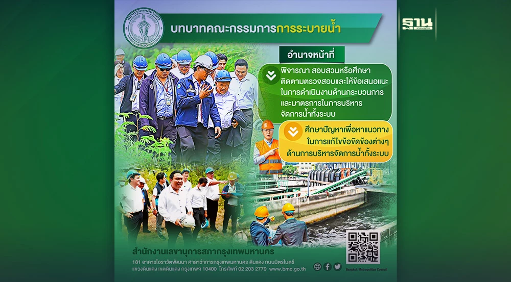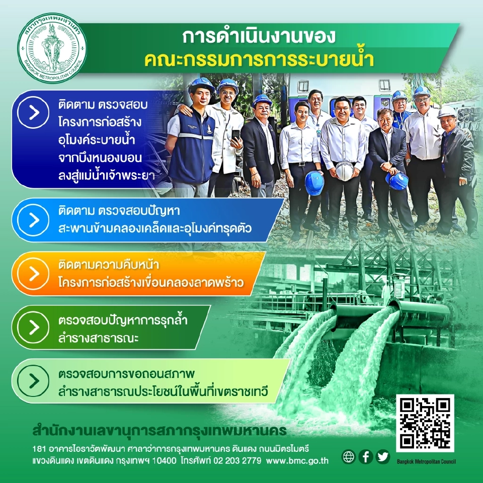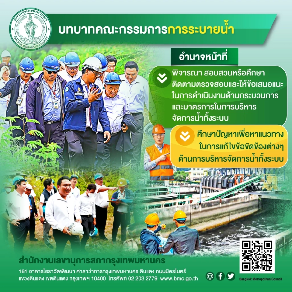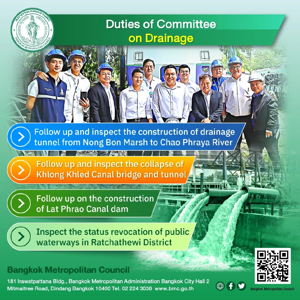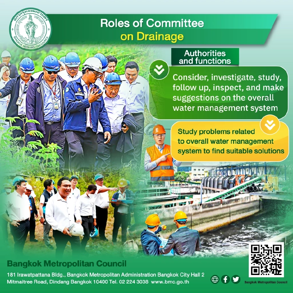 The Committee on Drainage is responsible for considering, investigating, studying, following up, inspecting and making suggestions on the operations of the BMA regarding water management procedures and measures. Examples of duties include flood warning and prevention, water drainage planning and operations, maintenance of water sources and waterways, water quality control, prevention of encroachment on public water sources and waterways, studying problems related to floods and water quality to find suitable solutions for all Bangkokians.