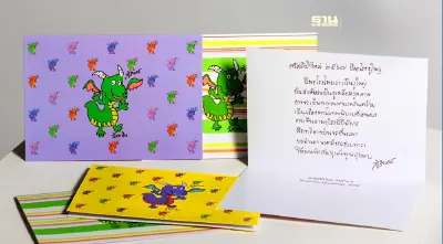- เสื้อทีเชิ้ตลายริ้วม่วง มีชื่อว่า มังกรโชคดี