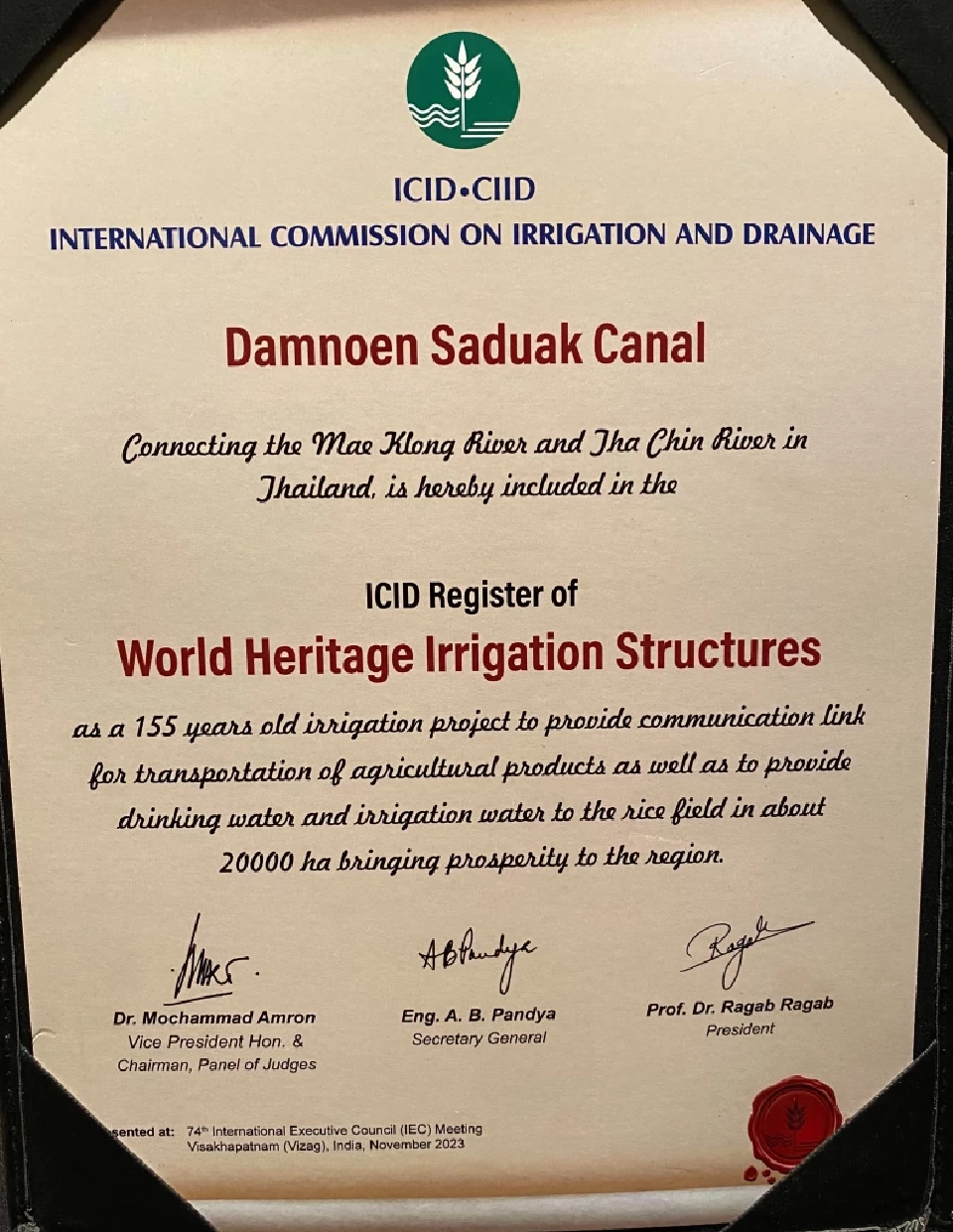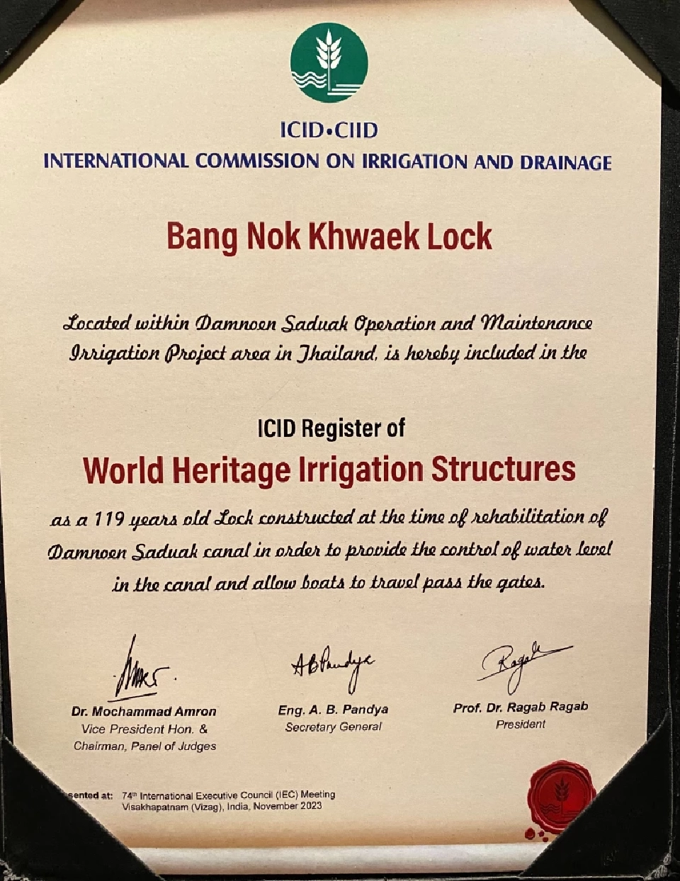 สำหรับการประชุมมนตรีฝ่ายบริหารระหว่างประเทศครั้งที่ 74 (The 74th IEC Meeting) ประเทศไทยในฐานะ THAICID ได้รับโล่รางวัลและประกาศนียบัตรขึ้นทะเบียนอาคารชลประทานมรดกโลก 2 รายการ คือ คลองดำเนินสะดวก (ก่อสร้างในปี 2411 อายุ 155 ปี) และประตูน้ำบางนกแขวก (ก่อสร้างในปี 2447 อายุ 119 ปี) ภายใต้การกำกับดูแลของสำนักงานชลประทานที่ 13 โดยนายชัยวัฒน์ ปรีชาวิทย์ เป็นผู้นำในกิจกรรมดังกล่าว ซึ่งรางวัลที่รับมอบจากคณะกรรมาธิการระหว่างประเทศว่าด้วยการชลประทานและการระบายน้ำ (ICID) นี้ ผ่านการพิจารณาแล้วว่าเป็นสิ่งก่อสร้างหรืออาคารชลประทานที่มีความสำคัญในอดีต และเป็นอาคารที่ใช้ประโยชน์มาอย่างต่อเนื่องมาจนถึงปัจจุบัน รางวัลนี้สร้างชื่อเสียงให้กับประเทศไทยและแสดงถึงการมีส่วนร่วมในระดับนานาชาติ