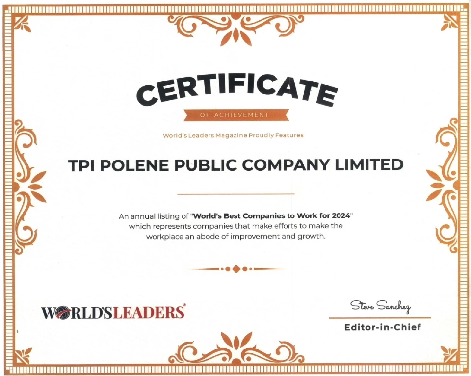 บริษัท ทีพีไอ โพลีน จำกัด (มหาชน) ได้รับใบประกาศนียบัตรรายชื่อประจำปีของ "บริษัทที่น่าทำงานที่สุดในโลกประจำปี 2567" ซึ่งแสดงให้เห็นว่าบริษัทได้จัดให้สถานที่ทำงานให้เป็นแหล่งรวมของสภาพแวดล้อมที่ดีและความก้าวหน้า จากนิตยสาร World’sLeaders ซึ่งเป็นนิตยสารเป็นบริษัทสื่อที่ครอบคลุมเรื่องราวของผู้นำทางธุรกิจทั่วโลก เป็นแรงบันดาลใจให้ผู้อ่านคิดนอกกรอบเดิมๆ เป็นผู้นำการสนทนา และสร้างอนาคตของธุรกิจ ตอกย้ำถึงความตั้งใจของบริษัทในการพัฒนาการเพื่อการเปลี่ยนแปลงอุตสาหกรรมและการส่งเสริมความยั่งยืน เป็นการปูทางสู่อนาคตที่เป็นมิตรกับสิ่งแวดล้อมมากขึ้นในประเทศไทยและระดับนานาชาติ