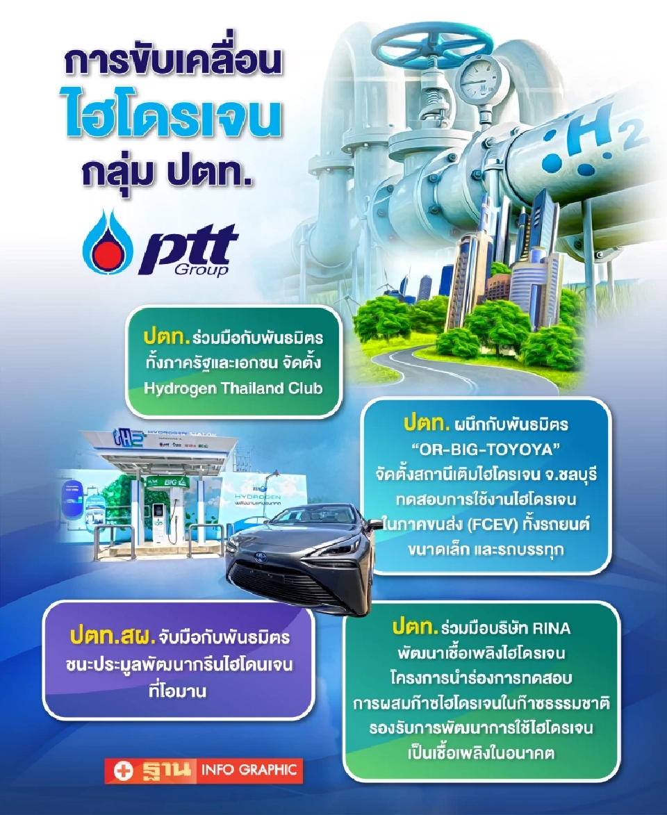 โดยในปี 2562 กลุ่ม ปตท. ได้จัดตั้ง Hydrogen Thailand Club ร่วมกับพันธมิตรทั้งภาครัฐและเอกชน เพื่อเตรียมความพร้อมและผลักดันในเรื่องเทคโนโลยีไฮโดรเจนให้กับประเทศไทย ปัจจุบันมีสมาชิก 54 บริษัท