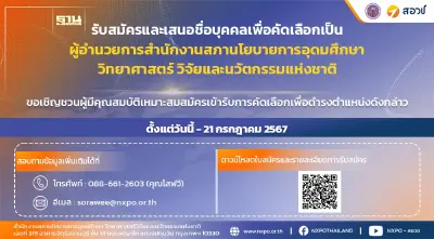 สำนักงานสภานโยบายการอุดมศึกษา วิทยาศาสตร์ วิจัยและนวัตกรรมแห่งชาติ (สอวช.) โดยคณะอนุกรรมการสรรหาและคัดเลือกผู้อำนวยการสำนักงานสภานโยบายการอุดมศึกษา วิทยาศาสตร์ วิจัยและนวัตกรรมแห่งชาติ เปิดรับสมัครและเสนอชื่อบุคคลเพื่อคัดเลือกเป็น “ผู้อำนวยการ สอวช."