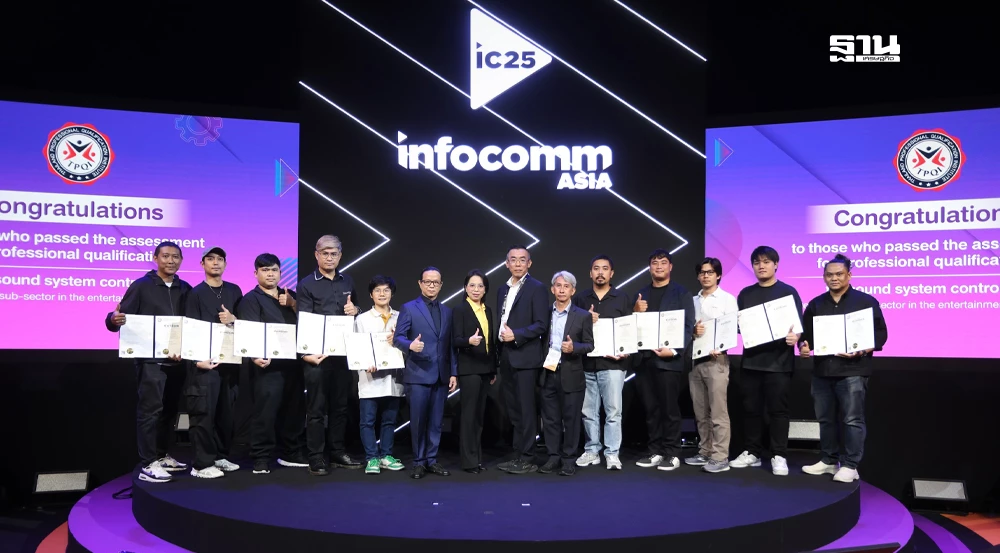 พิธีมอบประกาศนียบัตรคุณวุฒิวิชาชีพผู้ควบคุมอุปกรณ์ระบบเสียง มีนางสาวมะลิ จันทร์สุนทร ผู้อำนวยการสำนักรับรององค์กรรับรองและประเมินสมรรถนะของบุคคล เป็นผู้แทนผู้อำนวยการสถาบันคุณวุฒิวิชาชีพ ร่วมกล่าวแสดงความยินดี พร้อมมอบประกาศนียบัตรคุณวุฒิวิชาชีพ แก่ผู้ที่ผ่านการประเมินสมรรถนะตามมาตรฐานอาชีพ ผู้ควบคุมอุปกรณ์ระบบเสียง ระดับ 3 และ 4 จำนวน 16 คน ในงาน InfoCommAsia 2025 ณ ศูนย์การประชุมแห่งชาติสิริกิติ์ ซึ่งนับเป็นการ ยืนยันมาตรฐานอาชีพในสายงานด้านเสียงระดับประเทศอย่างเป็นทางการครั้งสำคัญในประวัติศาสตร์อุตสาหกรรมเสียงไทย