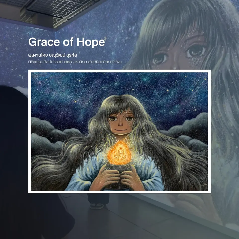 5) “Grace of Hope” ผลงาน “อณุวัฒน์ ธุระโส” นิสิตชั้นปีที่ 1 คณะศิลปกรรมศาสตร์ มหาวิทยาลัยศรีนครินทรวิโรฒ สะท้อนตัวตนของ “น้องอ๋อมแอ๋ม - น.ส.ณีรนุช สุริเตอร์” ที่มีความแข็งแกร่ง สามารถฝ่าฟันทุกสถานการณ์ที่ผ่านเข้ามาและก็ยืนหยัดที่จะอยู่ด้วยตนเองได้