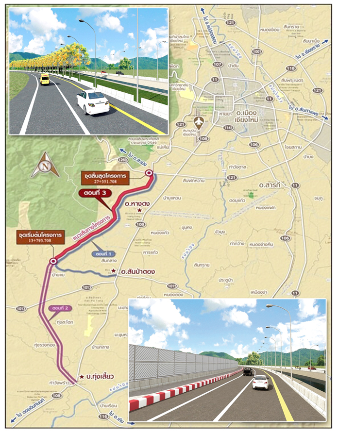 ทั้งนี้ในช่วงที่ผ่านมา ทช.ได้ดำเนินการก่อสร้างถนนสายเลี่ยงเมืองบ้านทุ่งเสี้ยว-บ้านสันป่าตอง-บ้านหางดง (ตอนที่1 และ 2) ในพื้นที่อำเภอหางดง,อำเภอสันป่าตอง จังหวัดเชียงใหม่ตั้งแต่ช่วงกิโลเมตรที่ 0+000 ถึงกิโลเมตรที่ 13+757.574 ขนาด4 ช่องจราจร แล้วเสร็จจึงสามารถดำเนินการต่อขยายในช่วงตอนที่ 3 ได้ทันที