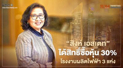 "สิงห์ เอสเตท "ได้สิทธิ์ซื้อหุ้น 30% ในโรงงานผลิตไฟฟ้าและความร้อนร่วม (Co-generation power plant) ขนาดใหญ่ 3 แห่งขายไฟฟ้าล่วงหน้าแล้วเกือบ 70% ของกำลังผลิตทั้งหมด