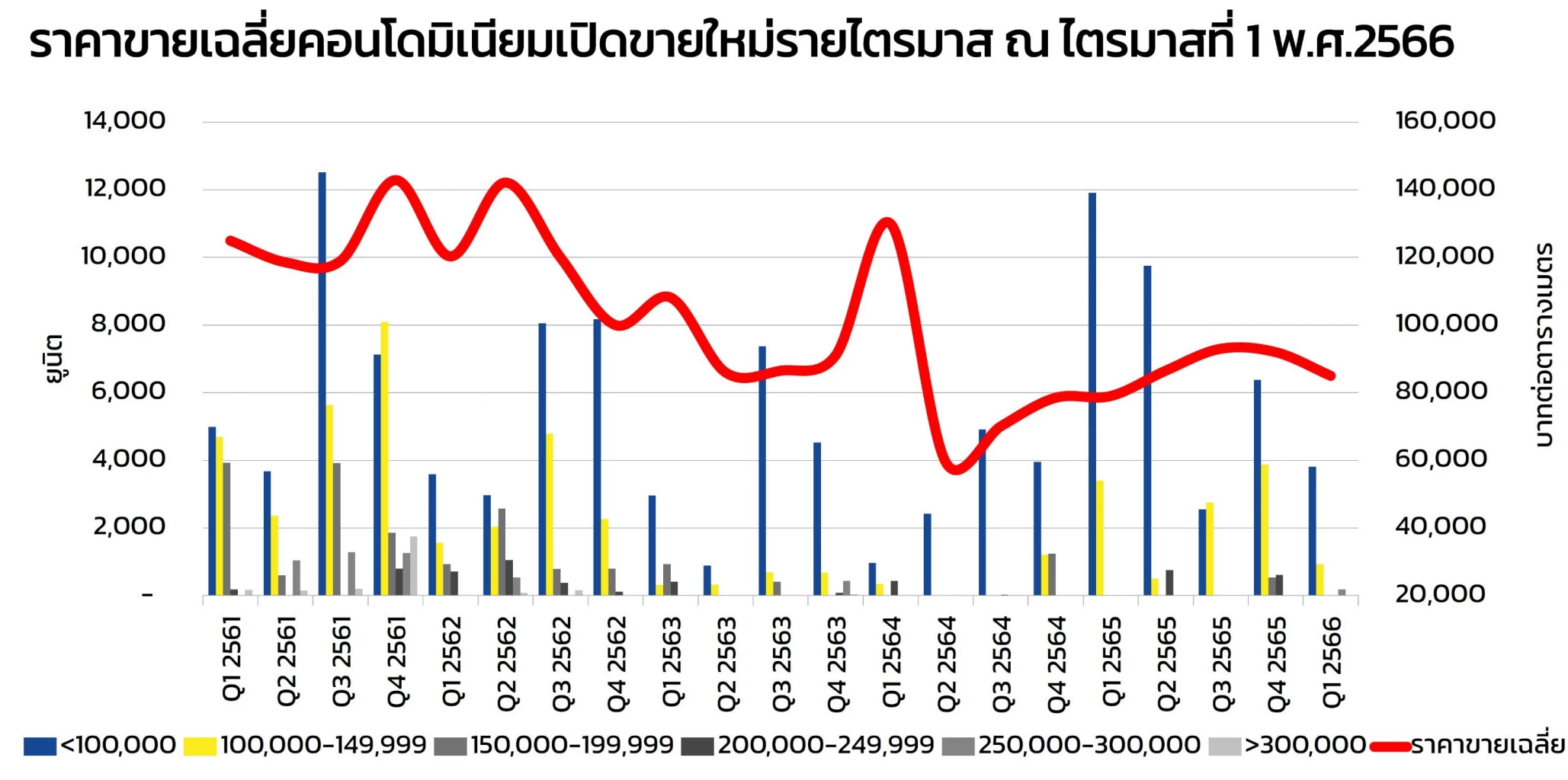 โดยไตรมาสที่ 1 พ.ศ.2566 พบคอนโดมิเนียมที่เปิดขายในราคาไม่เกิน 100,000 บาทต่อตารางเมตรยังคงมีสัดส่วนที่มากกว่าคอนโดมิเนียมในระดับราคาอื่นแบบชัดเจน โดยมีสัดส่วนประมาณ 77% เมื่อเทียบกับคอนโดมิเนียมในระดับราคาต่างๆ ซึ่งส่งผลให้ราคาขายเฉลี่ยคอนโดมิเนียมที่เปิดขายใหม่ในไตรมาสที่ 1 พ.ศ.2566 มีราคาขายเฉลี่ยลดลงจากไตรมาสก่อนหน้านี้เล็กน้อย