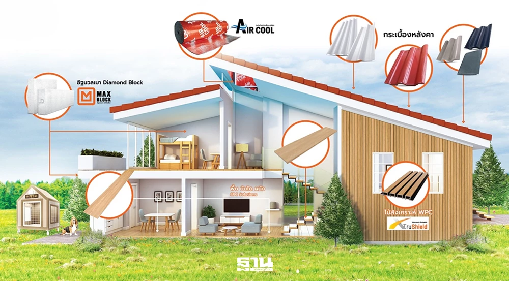 - ผลิตภัณฑ์ครอบคลุมทุกส่วนของบ้าน เช่น หลังคาสะท้อนความร้อน, อิฐมวลเบากันเสียง, ฉนวนกันความร้อน และพื้น SPC
