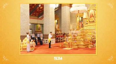 ครั้นเสด็จพระราชดำเนินถึง พระบาทสมเด็จพระเจ้าอยู่หัว ทรงจุดธูปเทียนเครื่องนมัสการพานทองสองชั้นบูชาพระพุทธปฏิมาชัยวัฒน์ รัชกาลที่ 1 ถึงรัชกาลที่ 7 และรัชกาลที่ 9 ที่หน้าพระที่นั่งบุษบกมาลา ทรงกราบ ทรงศีล พระราชาคณะถวายศีล จากนั้น เสด็จพระราชดำเนินไปทรงจุดธูปเทียนเครื่องทองน้อยบูชาเทวดาที่รักษาพระนพปฎลมหาเศวตฉัตร เครื่องราชกกุธภัณฑ์ ทรงคม