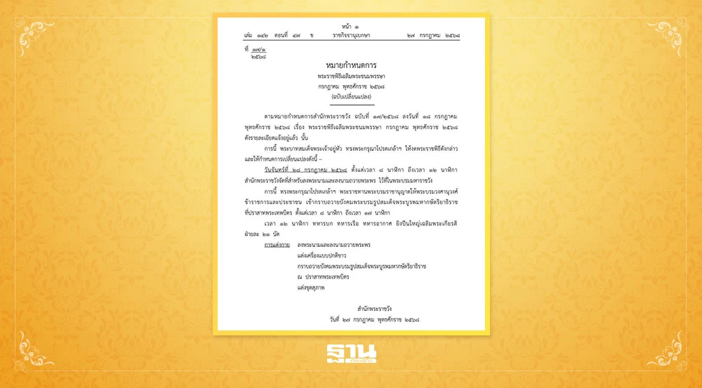 ราชกิจจานุเบกษา เผยแพร่หมายกำหนดการ พระราชพิธีเฉลิมพระชนมพรรษากรกฎาคม พุทธศักราช 2568 (ฉบับเปลี่ยนแปลง) โดยเนื้อหาระบุว่า