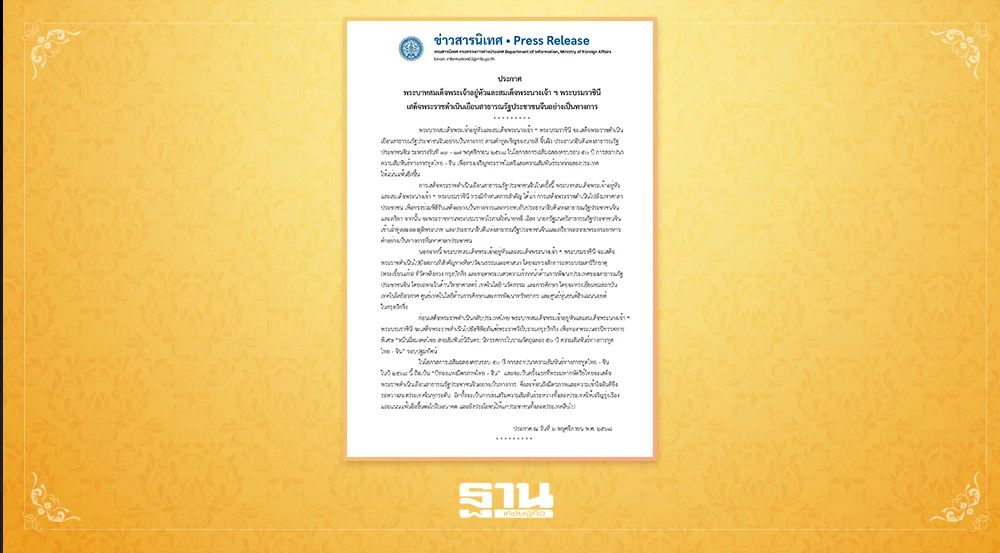 พระบาทสมเด็จพระเจ้าอยู่หัวและสมเด็จพระนางเจ้า ฯ พระบรมราชินี จะเสด็จพระราชดำเนินเยือนสาธารณรัฐประชาชนจีนอย่างเป็นทางการ ตามคำกราบบังคมทูลเชิญของ สี จิ้นผิง ประธานาธิบดีแห่งสาธารณรัฐประชาชนจีน ระหว่างวันที่ 13-17 พฤศจิกายน พ.ศ. 2568 ในโอกาสการเฉลิมฉลองครบรอบ 50 ปี การสถาปนาความสัมพันธ์ทางการทูตไทย-จีน เพื่อทรงเจริญพระราชไมตรีและส่งเสริมความสัมพันธ์ระหว่างสองประเทศให้แน่นแฟ้นยิ่งขึ้น