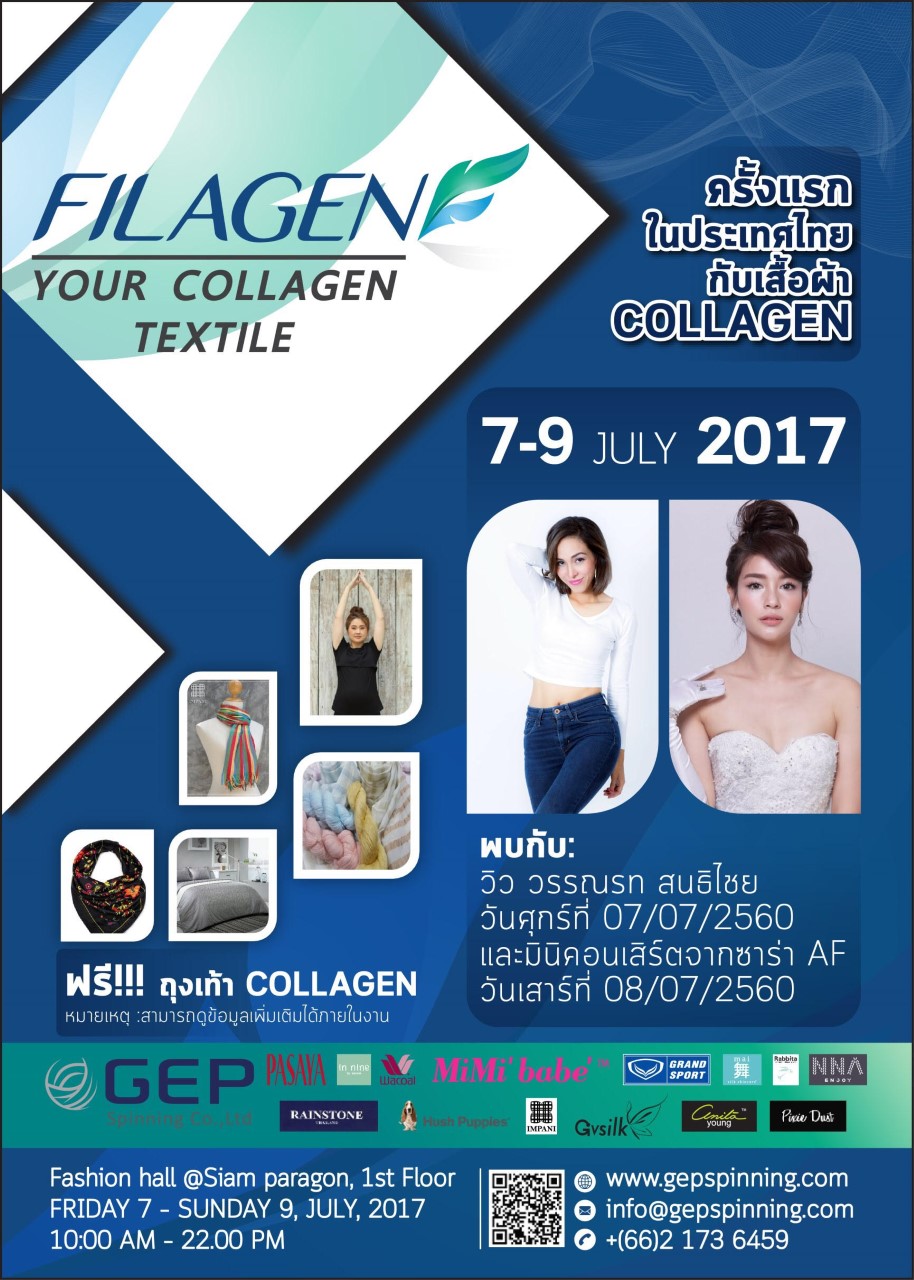 รายงานข่าวจากฟิลาเจน ชวนนักช้อปมาร่วมช้อปปิ้งผลิตภัณฑ์เสื้อผ้าที่มีส่วนผสมคอลลาเจนครั้งแรกในประเทศไทย! ช้อปก่อนใช้ก่อน นำเทรนด์ก่อน ผิวสวยก่อนใคร ในงาน “ฟิลาเจน ยัวร์ คอลลาเจน เท็กซ์ไทล์” (Filagen your Collagen Textile) ที่ยกทัพสินค้าผสมเส้นใยคอลลาเจนจากแบรนด์ดัง อาทิ อินไนน์ บาย วาโก้ (In nine by Wacoal) พาซาญ่า (PASAYA) แกรนด์สปอร์ต (GRAND SPORT) อิมพานิ (IMPANI) พิกซี่ ดัสต์ (PIXIE DUST) ฯลฯ นอกจากนี้ ยังได้พบกับมินิ แฟชั่นโชว์ โดย วิว วรรณรท สนธิไชย มินิคอนเสิร์ตจาก ซาร่า เอเอฟ 3 และนักฟุตบอลจากสโมสรดังในไทยลีกจะมานำเสนอเสื้อกีฬาผสมคอลลาเจน พบกัน 7-9 กรกฎาคม 2560 ณ ลานแฟชั่นฮอลล์ ศูนย์การค้าสยามพารากอน