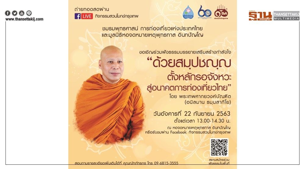 ซึ่งในงานนี้ คุณยุทธศักดิ์ สุภสร ท่านผู้ว่าการการท่องเที่ยวแห่งประเทศไทย, คุณสมฤดี จิตรจง รองผู้ว่าการด้านบริหาร และประธานชมรมพุทธศาสน์ การท่องเที่ยวแห่งประเทศไทย พร้อมด้วย นายแพทย์บัญชา พงษ์พานิช ผู้อำนวยการหอจดหมายเหตุพุทธทาส กราบนิมนต์ พระเทพศากยวงศ์บัณฑิต (อนิลมาน ธมฺมสากิโย) มามอบธรรมพร ขวัญและกำลังใจ ให้กับผู้ประกอบการการท่องเที่ยวและพี่น้องชาวไทยทุกคน