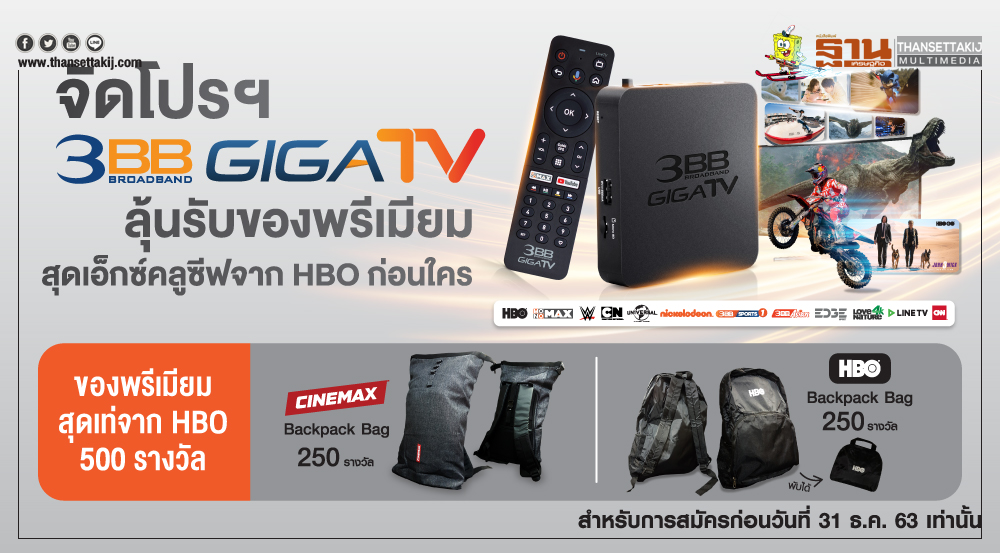 พิเศษสุดสำหรับลูกค้าใหม่และลูกค้าปัจจุบันที่สมัครและติดตั้ง 3BB GIGATV ผ่านทุกช่องทางภายในวันที่ 31 ธันวาคม 2563 ลุ้นรับ ของพรีเมียมสุดเอ็กซ์คลูซีฟ ไม่มีใครเหมือนและไม่เหมือนใคร จาก HBO จำนวน 500 รางวัล ได้แก่ Cinemax Backpack Bag จำนวน 250 รางวัล และ HBO Backpack Bag จำนวน 250 รางวัล โดย 3BB จะประกาศรายชื่อผู้โชคดี 500 ท่านในวันที่ 6 มกราคม 2564 ทาง 3BB Facebook Official Page และจัดส่งของพรีเมียมให้ถึงบ้าน