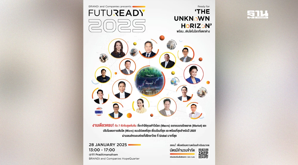 ปัจจุบันโลกเผชิญกับความคาดหวังที่สูงขึ้น ในขณะที่ความเข้าใจเกี่ยวกับวิธีและแนวทางในการเติบโตกลับน้อยลง ทำให้ผู้บริหารต้องเผชิญกับความท้าทายอย่างมากในการตัดสินใจในยุคที่เต็มไปด้วยความไม่แน่นอน บริษัท แบรนดิ แอนด์ คอมพานีส์ จำกัด ร่วมกับ BRANDi Institute of Systematic Transformation (BiOST) จัดงาน FUTURE-READY 2025 ภายใต้ธีม Ready for the Unknown Horizon โดยเวทีนี้จะเป็นหนึ่งใน แพลตฟอร์มการแลกเปลี่ยนองค์ความรู้จากผู้เชี่ยวชาญและผู้ทรงคุณวุฒิในแต่ละสาขาจากทุกภาคส่วน โดยงานจัดขึ้นในวันอังคารที่ 28 มกราคม พ.ศ. 2568 เวลา 13:00 - 17.00 น. ณ BRANDi HopeQuarter ที่อาคาร 111 ประดิษฐ์มนูธรรม (อาคาร A)