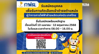 กฟผ. เปิดรับสมัครผู้ว่าการคนใหม่ ยื่นใบสมัครด้วยตนเอง 10 เม.ย. - 13 พ.ค. 68 สอบถามเพิ่มเติมโทร 0 2436 5323 หรือดูรายละเอียดที่ www.egat.co.th