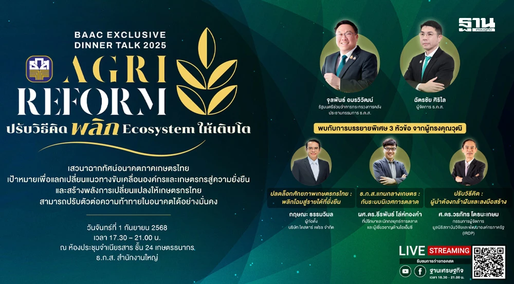 พบกับ BAAC Exclusive Dinner Talk 2025 ที่จะเปิดมุมมองใหม่ในการ พลิกระบบนิเวศเกษตรไทย ด้วยนวัตกรรมและเทคโนโลยีที่ทันสมัย ซึ่งจะทำให้ภาคเกษตรของไทยเติบโตอย่างยั่งยืน