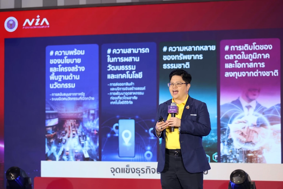 “นวัตกรรมไทยยังมีโอกาสที่จะขับเคลื่อนสู่การเติบโตระดับโลกต่อไป โดยหัวใจสำคัญอยู่ที่การเร่งสร้างผู้ประกอบการฐานนวัตกรรมที่พร้อมแข่งขันในตลาดโลก จากจุดเด่นด้านการวิจัยและพัฒนา (R&D) ซึ่ง NIA ตั้งเป้าที่จะสร้างระบบนิเวศนวัตกรรมครบวงจร ผ่านการทำงานร่วมกับพันธมิตรทั้งในและต่างประเทศ สร้างผลกระทบเชิงบวกทางเศรษฐกิจและสังคมอย่างยั่งยืน ภายใต้กลยุทธ์ ‘Groom - Grant - Growth - Global’ อันเป็นการเพิ่มจำนวนผู้ประกอบการฐานนวัตกรรมที่พร้อมแข่งขันในตลาด สร้างมูลค่าเพิ่มทางเศรษฐกิจ และขับเคลื่อนเศรษฐกิจไทยสู่เศรษฐกิจฐานนวัตกรรม”