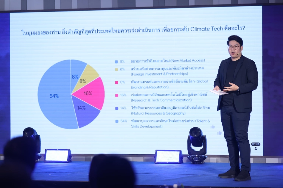 นอกเหนือจากเวทีเสวนาที่ร่วมถ่ายทอดมุมมองและประสบการณ์ในงาน Global Innovation Forum 2025 แล้ว ในงานยังปิดท้ายด้วยกิจกรรมเวิร์กชอป เพื่อแลกเปลี่ยนข้อเสนอแนะ ภายใต้หัวข้อ Recommendation for Climate Tech Innovation Development in Thailand: ข้อเสนอแนะแนวทางการสร้างนวัตกรรมด้านไคลเมทเทคในประเทศไทย โดย คุณณัฐดนย์ โกศัยธนอนันท์ ที่มารับหน้าที่ Facilitator โดยเปิดให้ผู้เข้าร่วมงานทุกท่านร่วมกันกำหนดแนวทางพัฒนาศักยภาพไคลเมทเทคของไทย (Climate Tech Ecosystem) ให้เข้มแข็งและแข่งขันได้ในระดับสากล